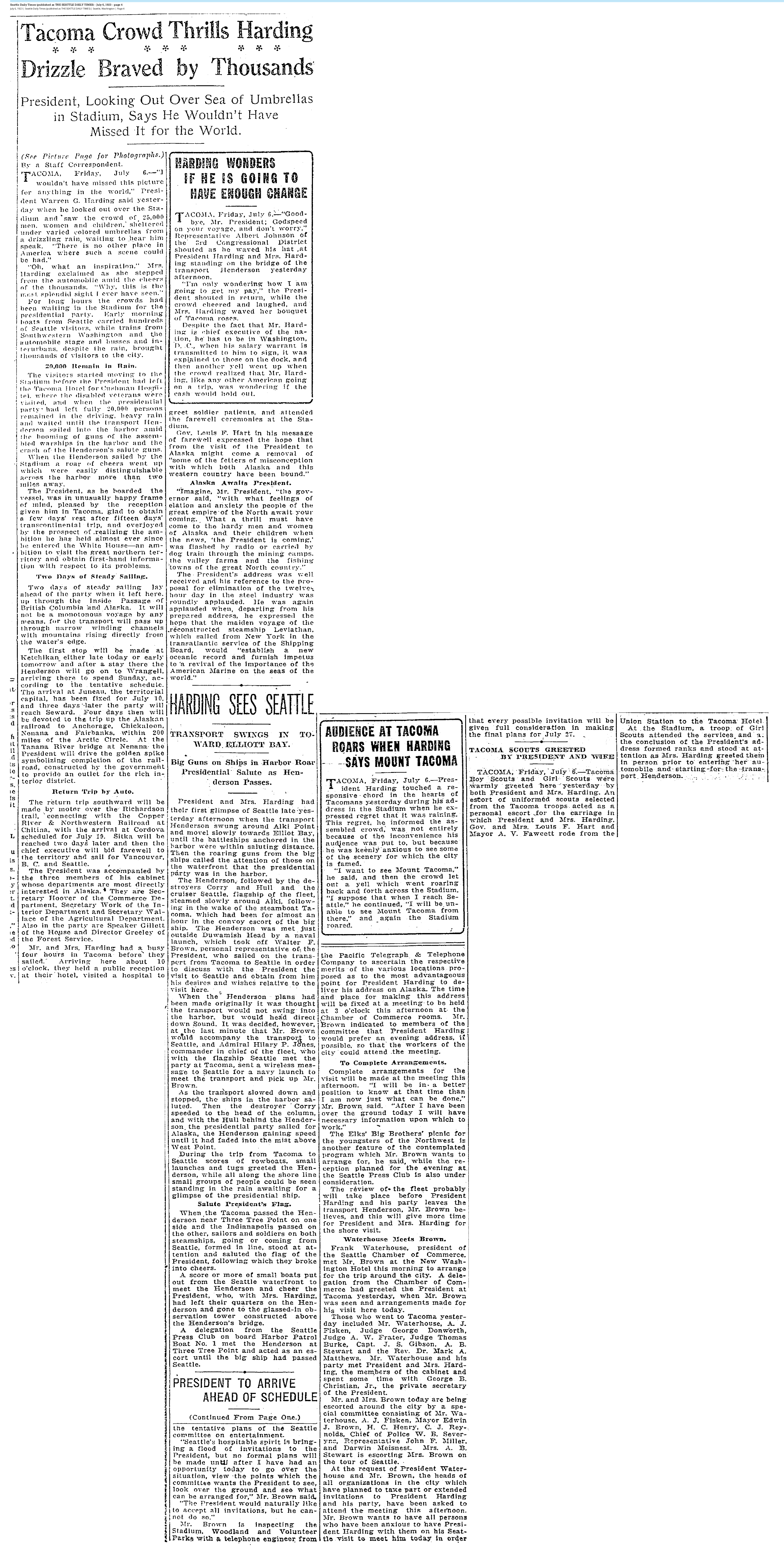 1923 07-06 STimes p4 July 12, 2023 3064 × 6088 Seattle Now & Then: Harding, big crowds at Woodland Park & UW, 1923 July 6, 1923, Seattle Times, p4.
