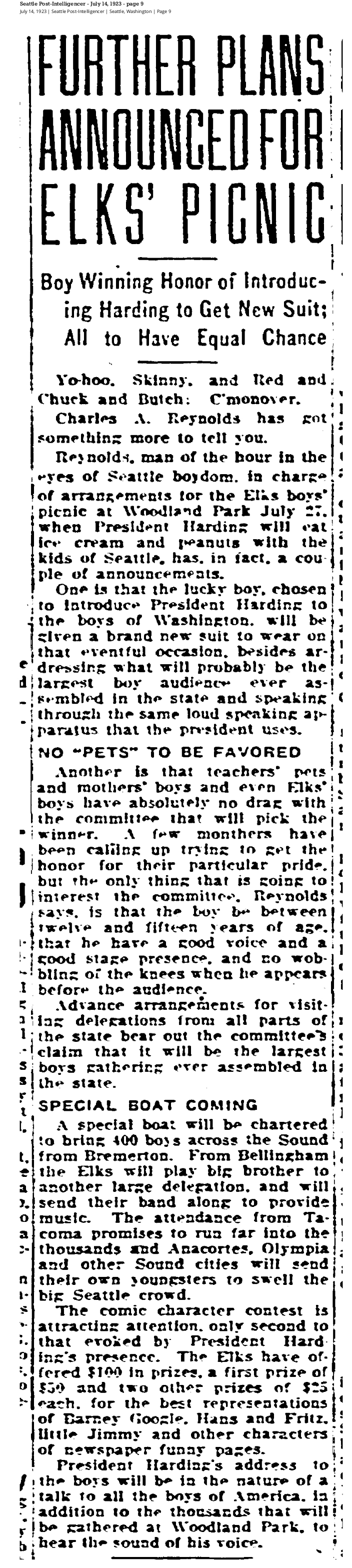 1923 07-14 SPI p9 July 12, 2023 704 × 3135 Seattle Now & Then: Harding, big crowds at Woodland Park & UW, 1923 July 14, 1923, Seattle Post-Intelligencer, p9.