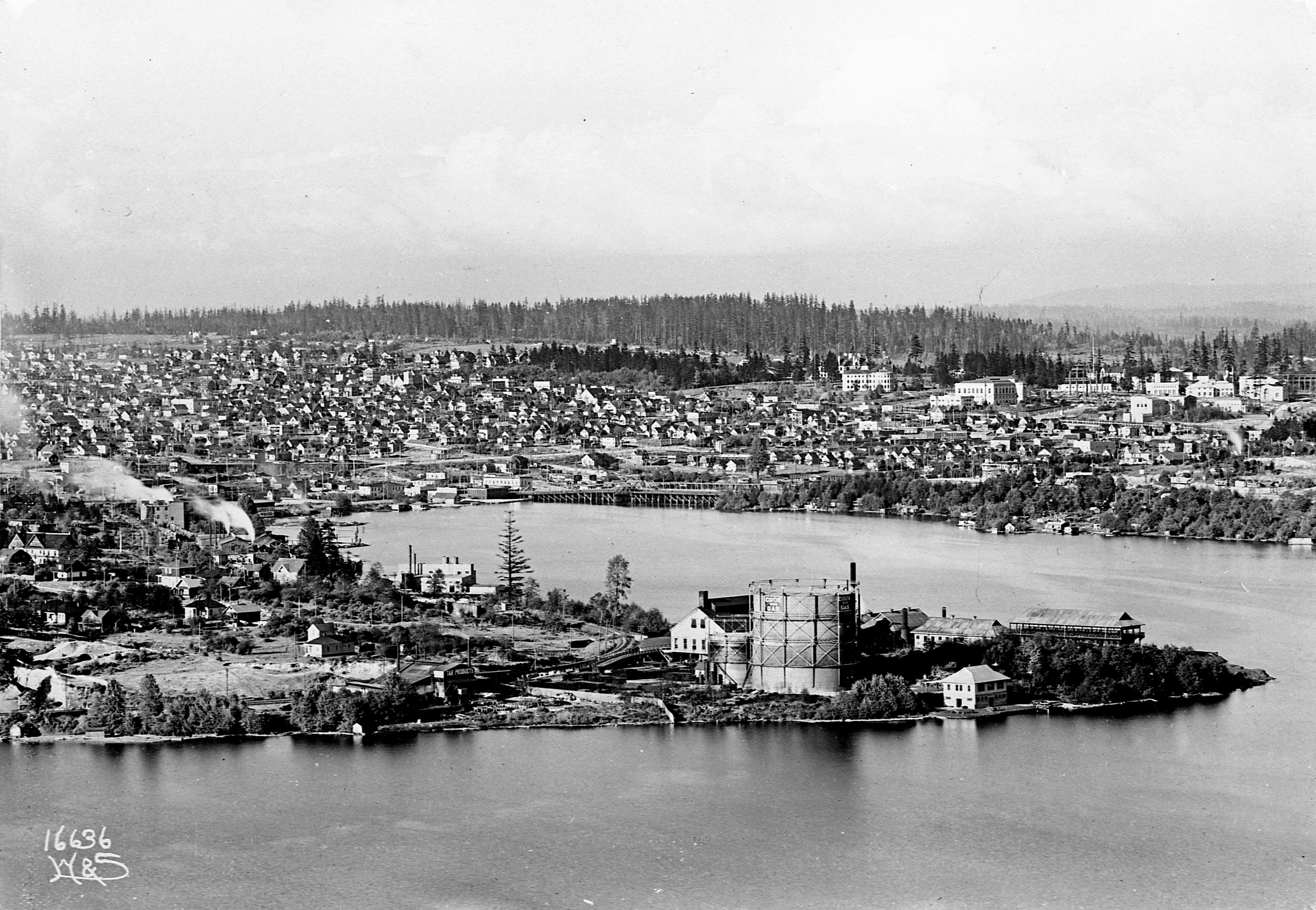 THEN1: Taken from northeast Queen Anne Hill, this 1910 view shows the coal gasification plant fully operational. Just behind it, across Portage Bay, stands the University of Washington, site of the previous year’s Alaska-Yukon-Pacific Exposition. Virgin timber on the horizon lines what are known today as the View Ridge and Hawthorne Hills neighborhoods.