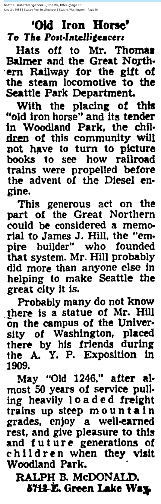 1953 06-24 SPI p16 July 25, 2023 534 × 1665 Seattle Now & Then: Woodland Park Zoo Locomotive #1246, 1953 June 24, 1953, Seattle Post-Intelligencer, p16.