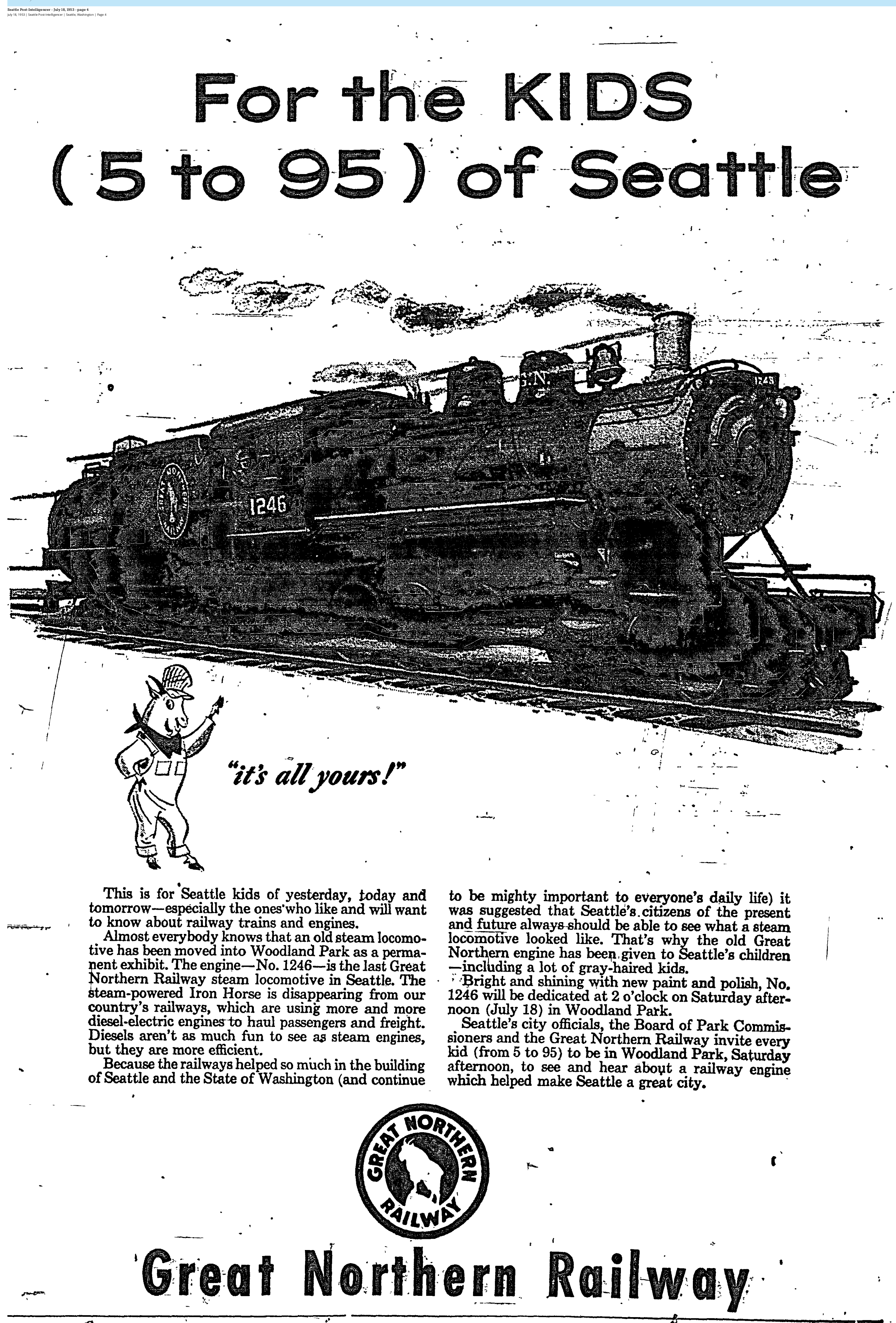 1953 07-18 SPI p4 July 25, 2023 2739 × 4043 Seattle Now & Then: Woodland Park Zoo Locomotive #1246, 1953 July 18, 1953, Seattle Post-Intelligencer, p4.