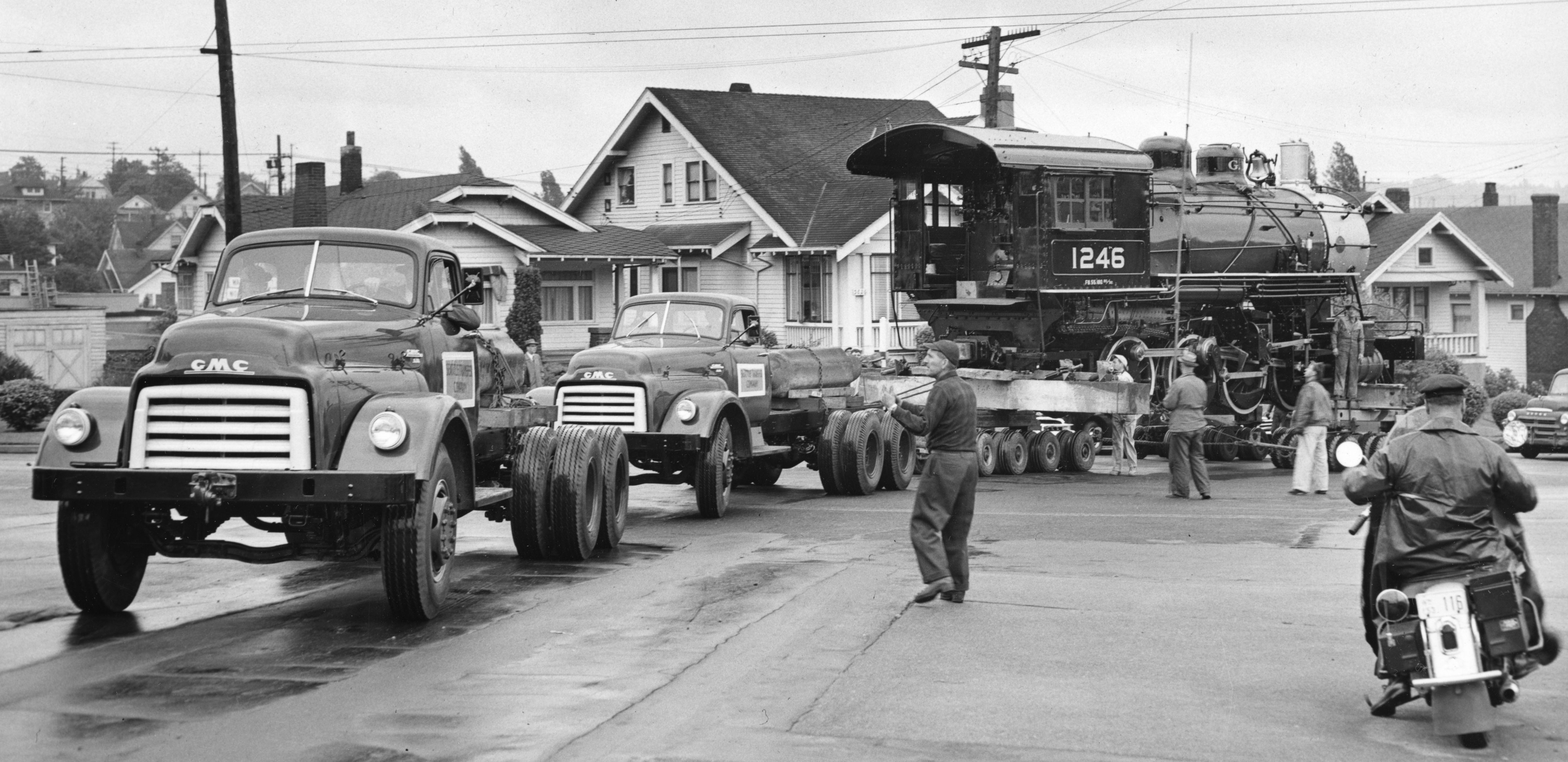 THEN3 (online only): A Seattle Transfer Co. crew moves locomotive #1246 to Woodland Park Zoo prior to a July 18, 1953, dedication ceremony that drew 500 people and Koondi, a zoo chimp. (Walter Ainsworth Collection, Great Northern Railway Historical Society)