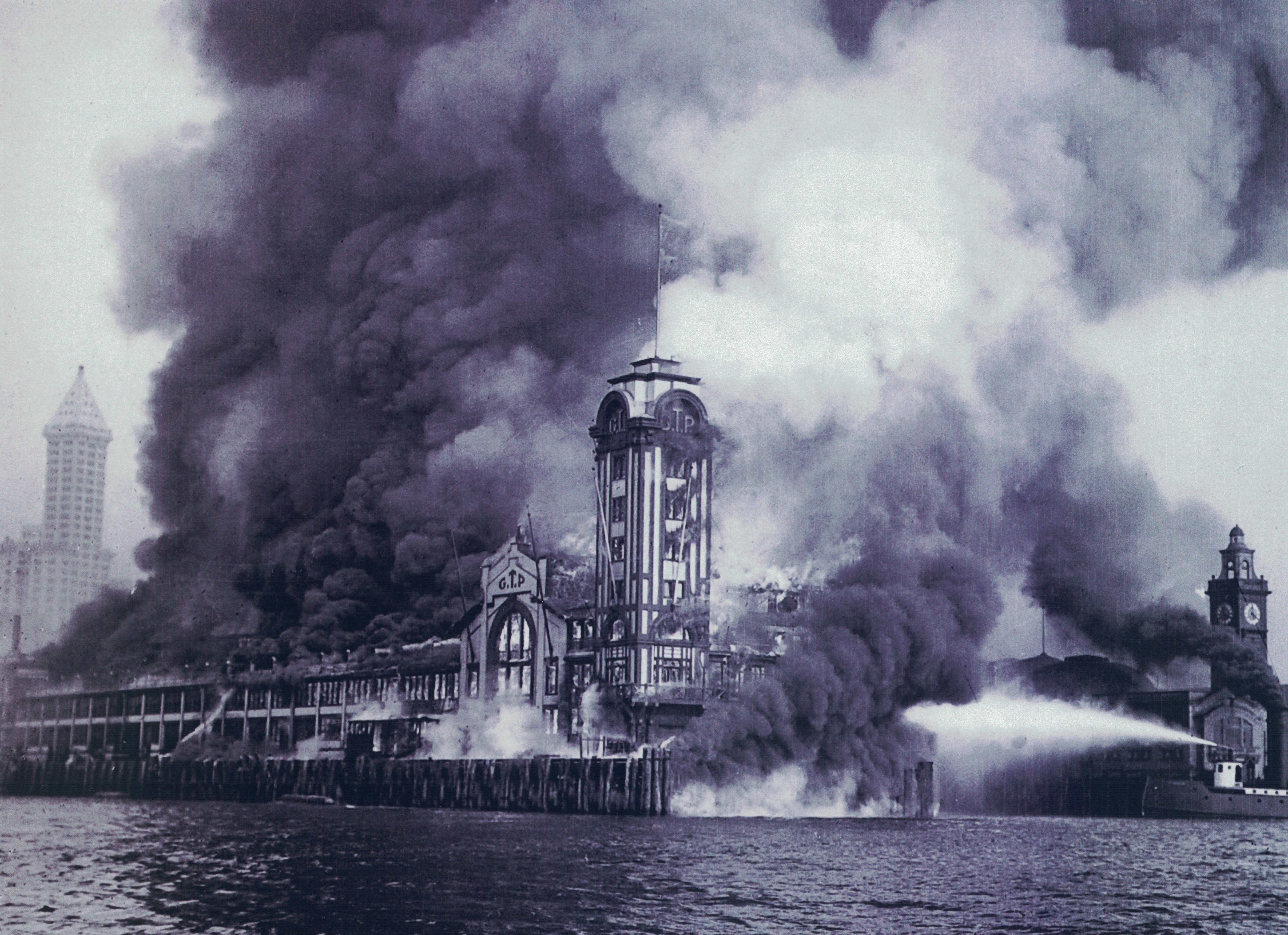 THEN2: The fireboat Duwamish, lower right, fights futilely to save the Grand Trunk Pacific Dock, north of Colman Dock, on July 30, 1914. At upper left is the Smith Tower, from which many watched the blaze. The tower had opened earlier that month on Independence Day. Colman Dock, built in 1882 and rebuilt after 1889’s Great Seattle Fire, is above the Duwamish at right. (Courtesy Bob Carney)