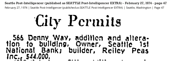 1974 02-27 SPI, p47 August 21, 2023 573 × 209 Seattle Now & Then: Landmarked bank on Denny Way, 1950 Feb. 27, 1974, Seattle Post-Intelligencer, p47.