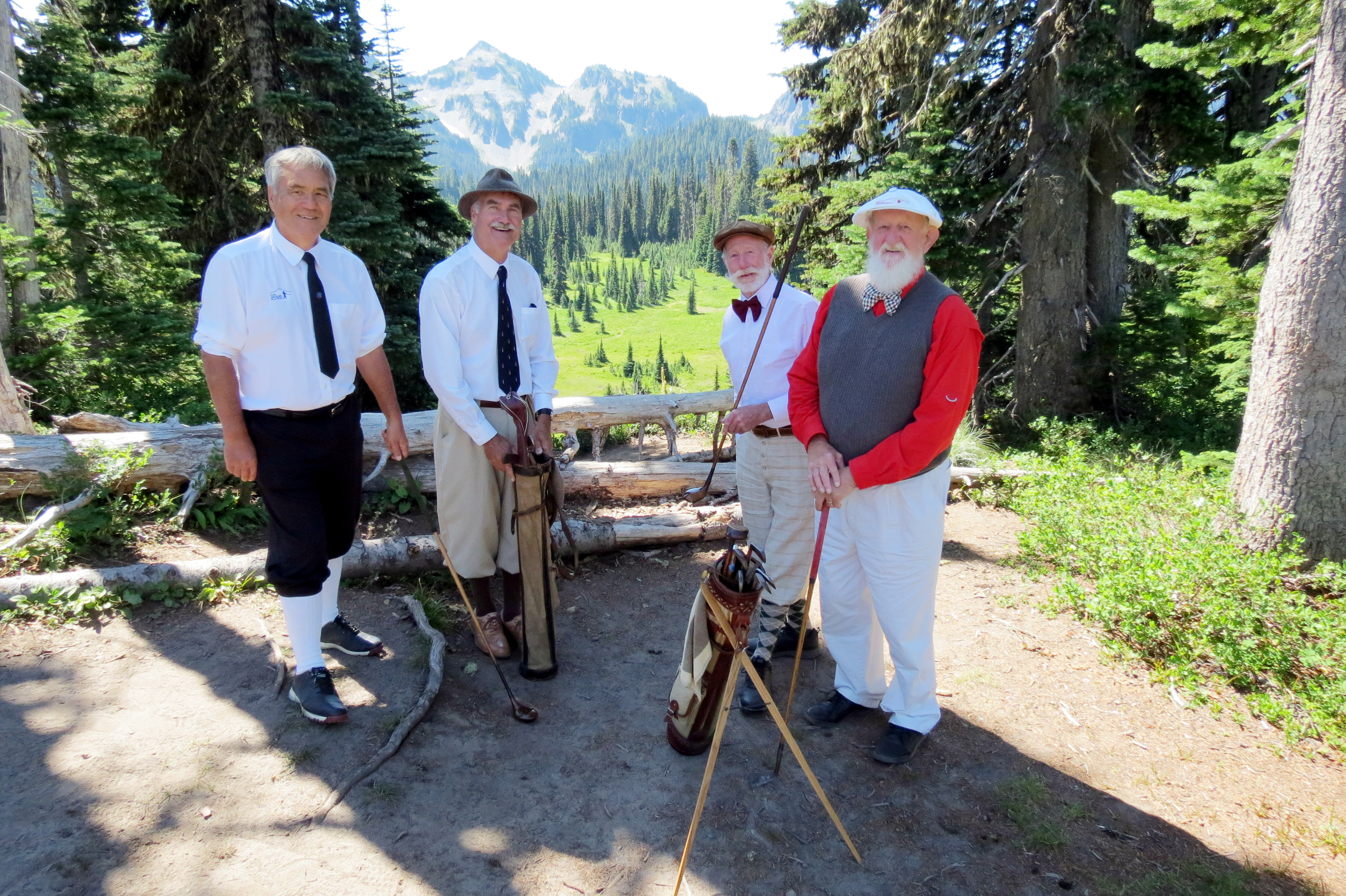 NOW2: In this south-facing view, Northwest Hickory Players (from left) Martin Pool, John Quickstad, Gary Smyres and Rob Ahlschwede stand at the former tee-off site for hole No. 1 for Paradise Golf Course in Mount Rainier National Park. The hole’s fairway green lay 300 feet below. (Clay Eals)
