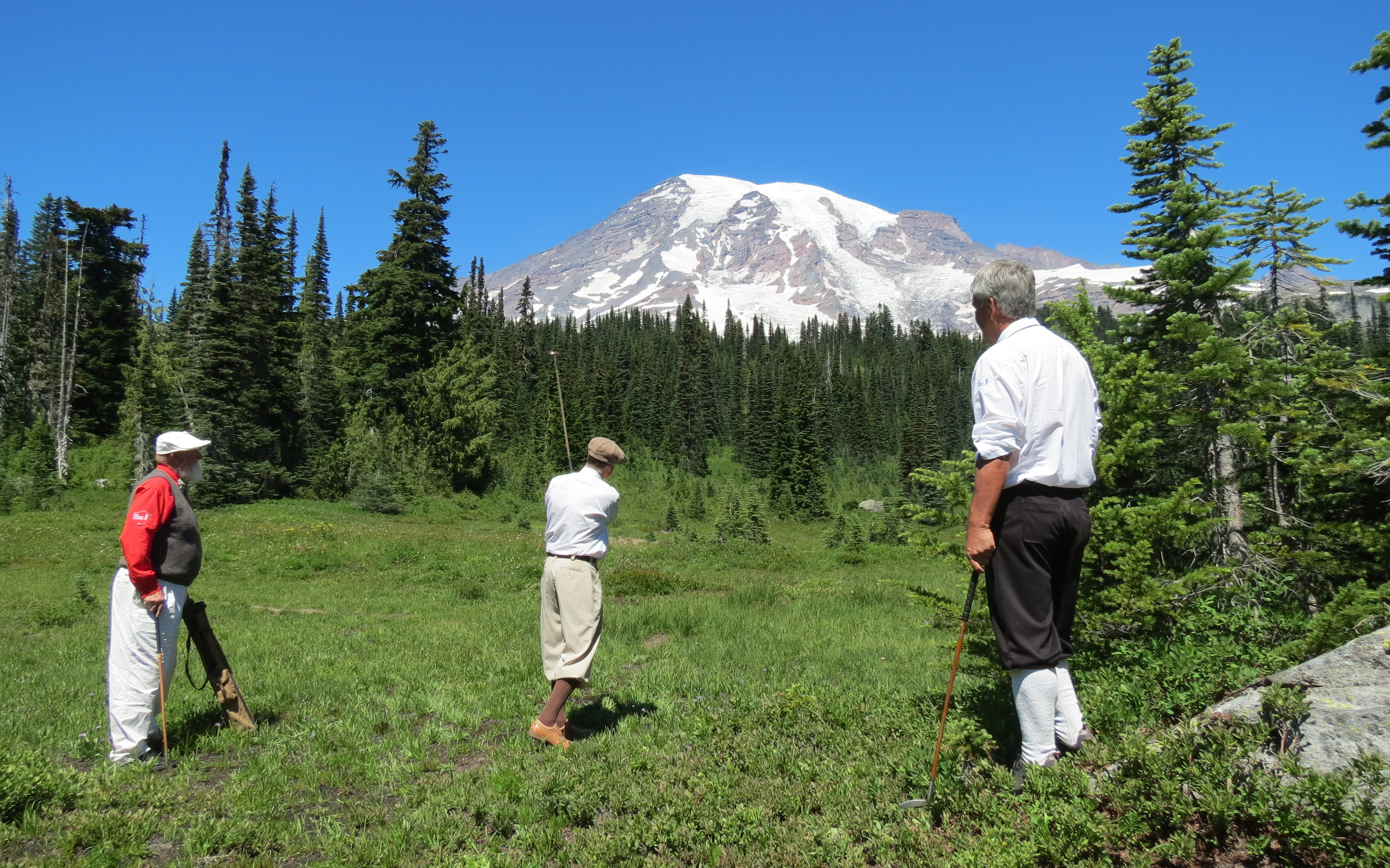 N&T Paradise golf NOW3 September 13, 2023 4000 × 2499 Seattle Now & Then: Paradise Golf Course at Mount Rainier, 1931 NOW3: Northwest Hickory Players (from left) Rob Ahlschwede, John Quickstad and Martin Pool replicate the positions of the 1931 golfers teeing off at the site of hole No. 6 green at Paradise Golf Course in Mount Rainier National Park. (Clay Eals)