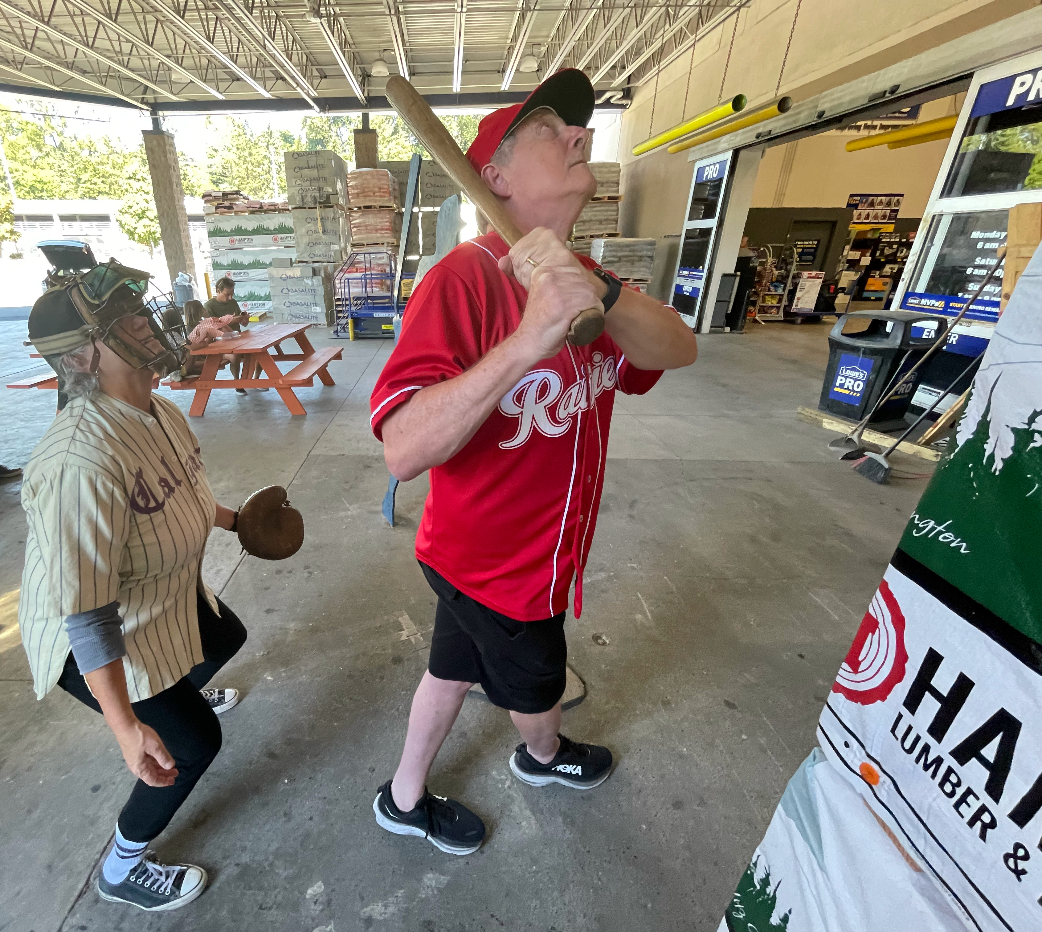 NOW1: Mike Burns of Fremont uses a Babe Ruth-model bat to mirror the slugger’s 1924 swing at the home-plate display at Lowe’s Home Improvement, formerly the site of Dugdale Park and Sick’s Stadium. Burns’ grandfather, Bobby Burns, starred at first base for Seattle amateur teams and is named in a program for the Oct. 19, 1924, exhibition game as batting fifth behind Ruth. Mimicking the catcher with period mask and mitt is Devorah Romanek, exhibit chief at the Museum of History & Industry, whose “Baseball All-Stars” exhibit runs through Nov. 5. (Clay Eals)