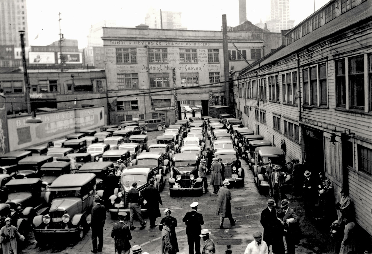 Sneak a glance back at Colman Dock where patient motorists wait to cross the Sound. If Bremerton bound, they might be in for a treat, boarding the Black Ball’s sparkling new flagship Kalakala, whose streamlined design and Art Deco interiors reflected a hopeful future. (For $10, “Cap” had acquired the Peralta, a California ferry burned to the waterline, and built the maritime marvel).