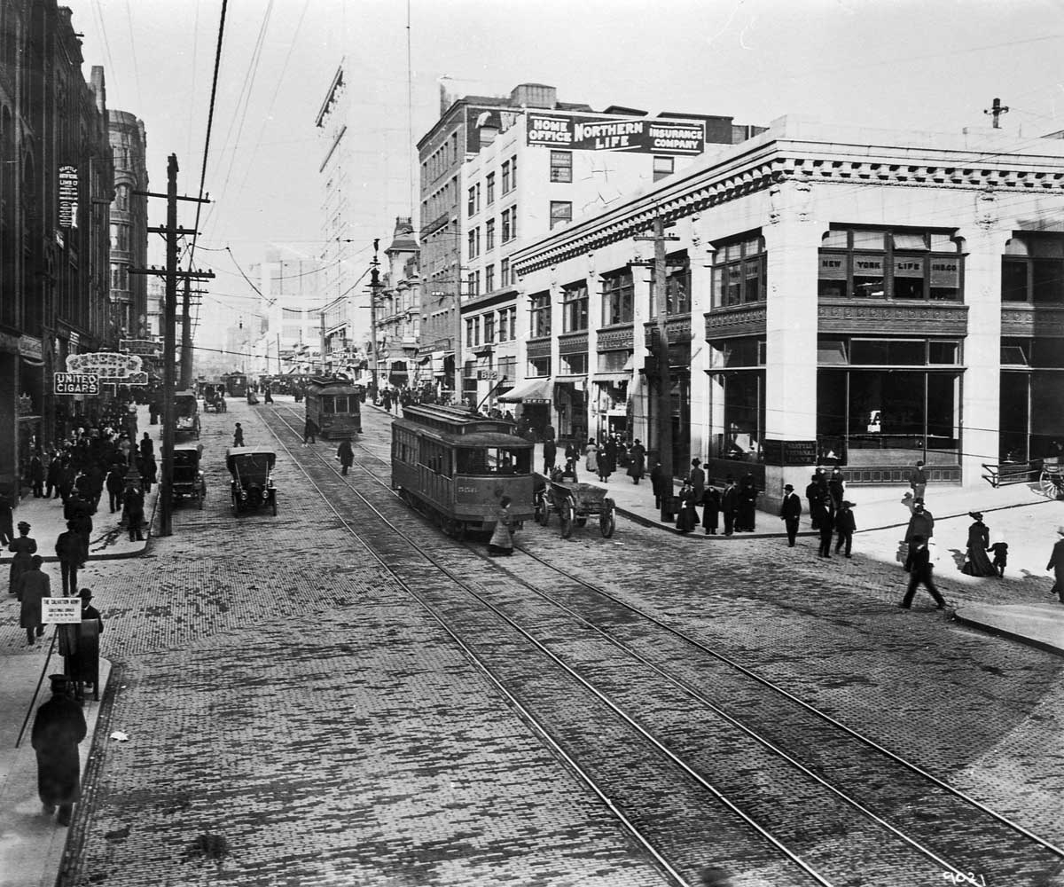 Based on the photographer Asahel Curtis’ number for this subject it was taken late in 1907. The view looks north on Second towards its intersection with Columbia. The new Seattle National Bank is on the right, a fresh replacement for the Chapin Block.