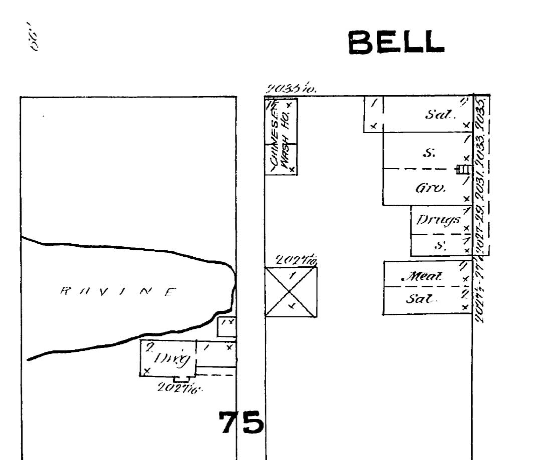 The 1884 Sanborn map – a detail showing the southwest corner of Bell and Front (First) and the Belltown Ravine too, although here its intrusion east of the waterfront is stopped at Western Avenue, when in 1883, at least, it still reach a short way east of First (Front) Avenue.