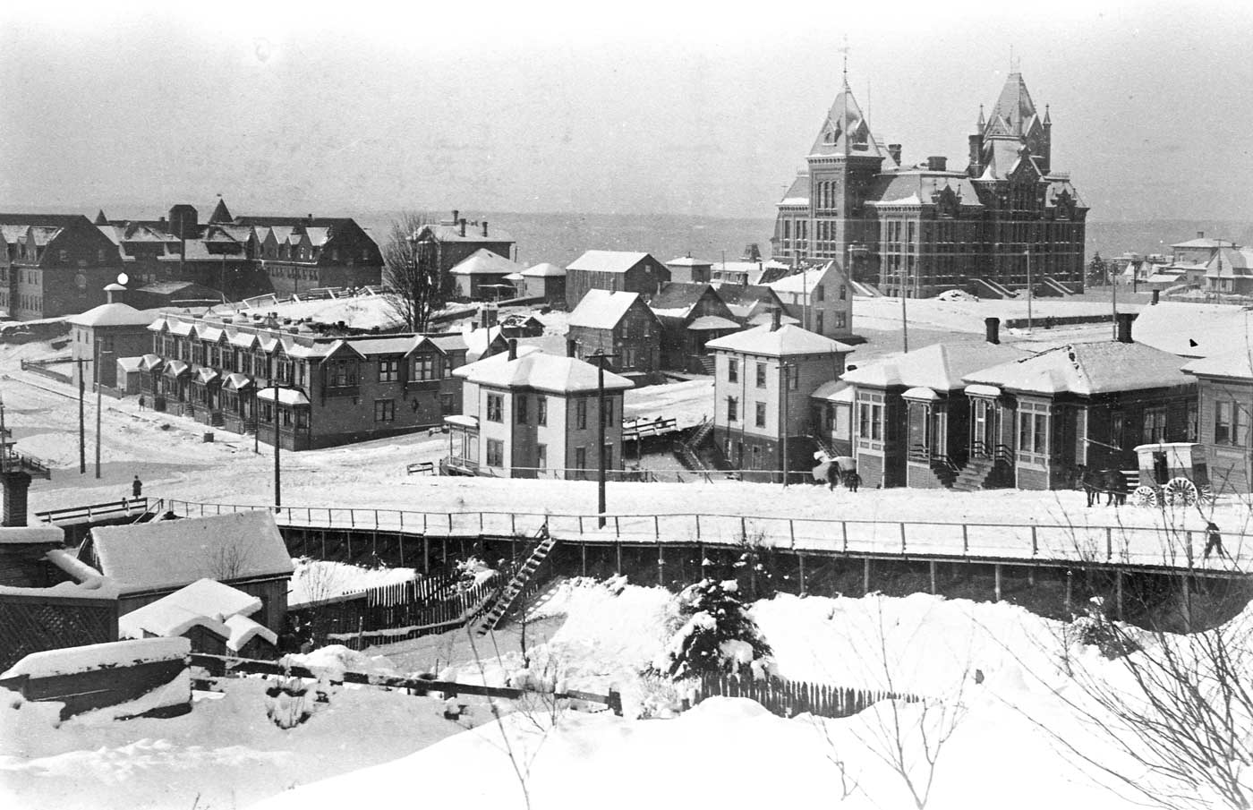 Central School, on the right, and the Rainier Hotel, on the left, photographed during an unidentified snow from the 1890s. The photographer stood on 8th Ave. south of Columbia Street. Had the camera been turned a few degrees to the left, it would have included some of the Fire Dept. Headquarters.