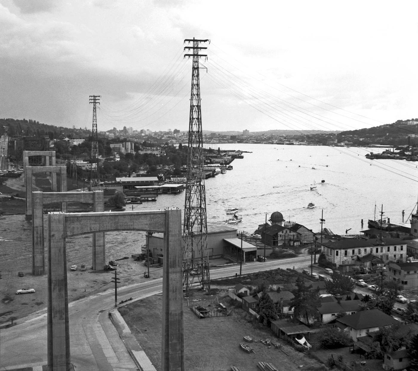 This for some agoraphobic look north through the construction line for the Lake Washington Ship Canal Bridge includes a late glimpse of the Latona Hotel, far-right, across Northlake from it the Wigwam Shingle Mill. This rare capture is shown again in one of the three linked photos featured below.