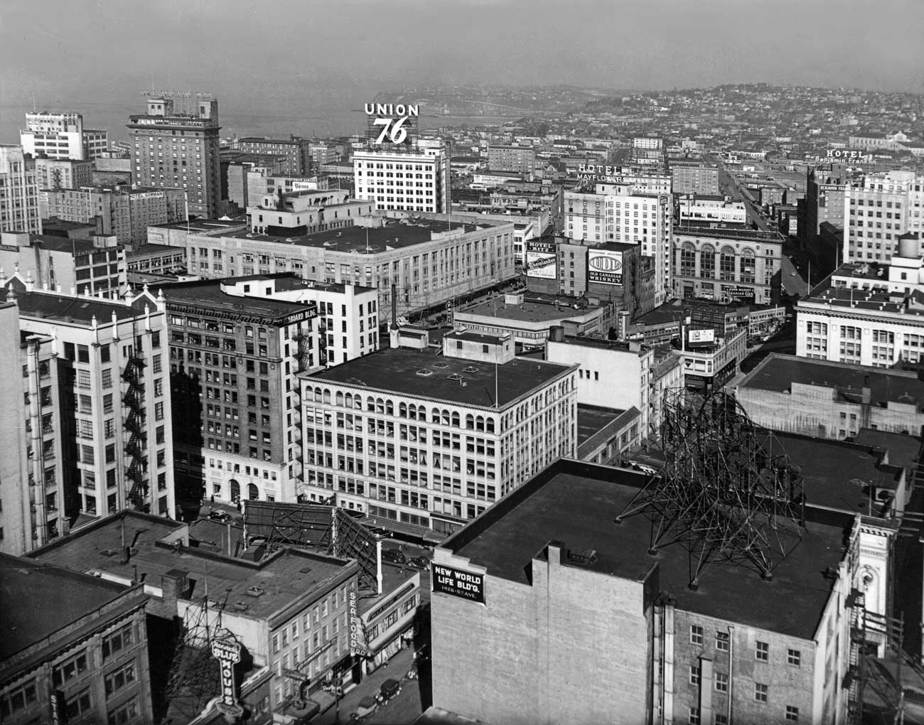 An “aerial” from the top of the then new Washington Athletic Club at the southeast corner of 6th and Union. Please take note of both the Blue Mouse Theatre and to its side Don’s Seafood Restaurant, both on the west side of 5th between Union and Pike. Don’s was later purchase by Ivar Haglund for his first “fancy” restaurant, Ivar’s Fifth Avenue. It later got a name change to the Captain’s Table before it was moved to the waterfront near the foot of Denny Way.