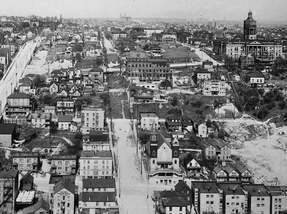 6. Lady-of-Good-Help-WEB January 13, 2013 1000 × 747 6. Lady-of-Good-Help-WEB Returning to the 1913 look east from the nearly completed Smith Tower we see by now many “familiars” – the alley and its row, Puget Power, the King County Court House, Kalmar Hotel, and, near the bottom-center, Our Lake of Good Help Catholic Church.