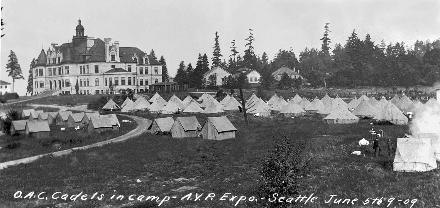 When the Oregon Cadets raised their tents on the Denny Hall lawn in 1909 they were almost venerable. Founded in 1873, the Cadets survive today as Oregon State University’s ROTC. Geneticist Linus C. Pauling, twice Nobel laureate, is surely the school’s most famous cadet corporal. (courtesy, University of Washington Libraries)