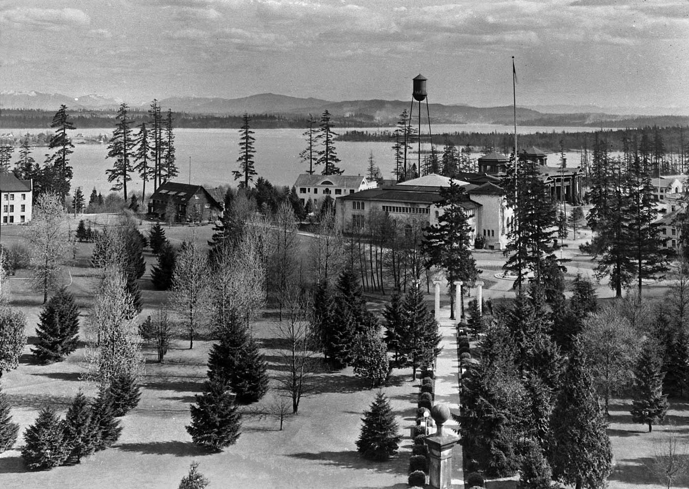 Some few years after the 1909 AYP, looking southeast from Denny’s Hall’s cupola in line with its sidewalk to the first location the pioneer Columns were shown when they were first moved to the new campus from the old about the time of AYP. The Forestry Building can be found to the right of the water tower, which breaks the far horizon of Cougar Mountain and so very near Hillside School where Jean teaches drama and writing – and much else.