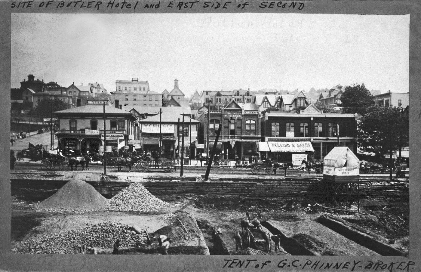 7.-Post-89-Fire-'Butler-Hotel'-WEB June 24, 2012 1400 × 904 7.-Post-89-Fire-'Butler-Hotel'-WEB Looking east from Pioneer Square (or place) mid-block to the surving structures on the east side of Second Avenue between James, on the right, and Cherry, on the left.