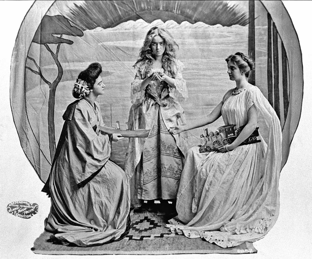 Probably the most viewed and best remembered women of the fair were three three, and the many “spin-offs” that followed their pose here for the “three graces” symbol of the AYPE. Here they hold objects that represent shipping, prospecting or mining and railroading.