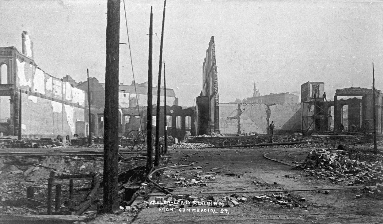Ruins from the 1889 fire looking north on Commercial Street from Washington Street. The standing wall at the scene’s center is the west facade of the otherwise razed Yesler-Leary Building at the northwest corner of Front (First Ave.) and Mill (Yesler way).