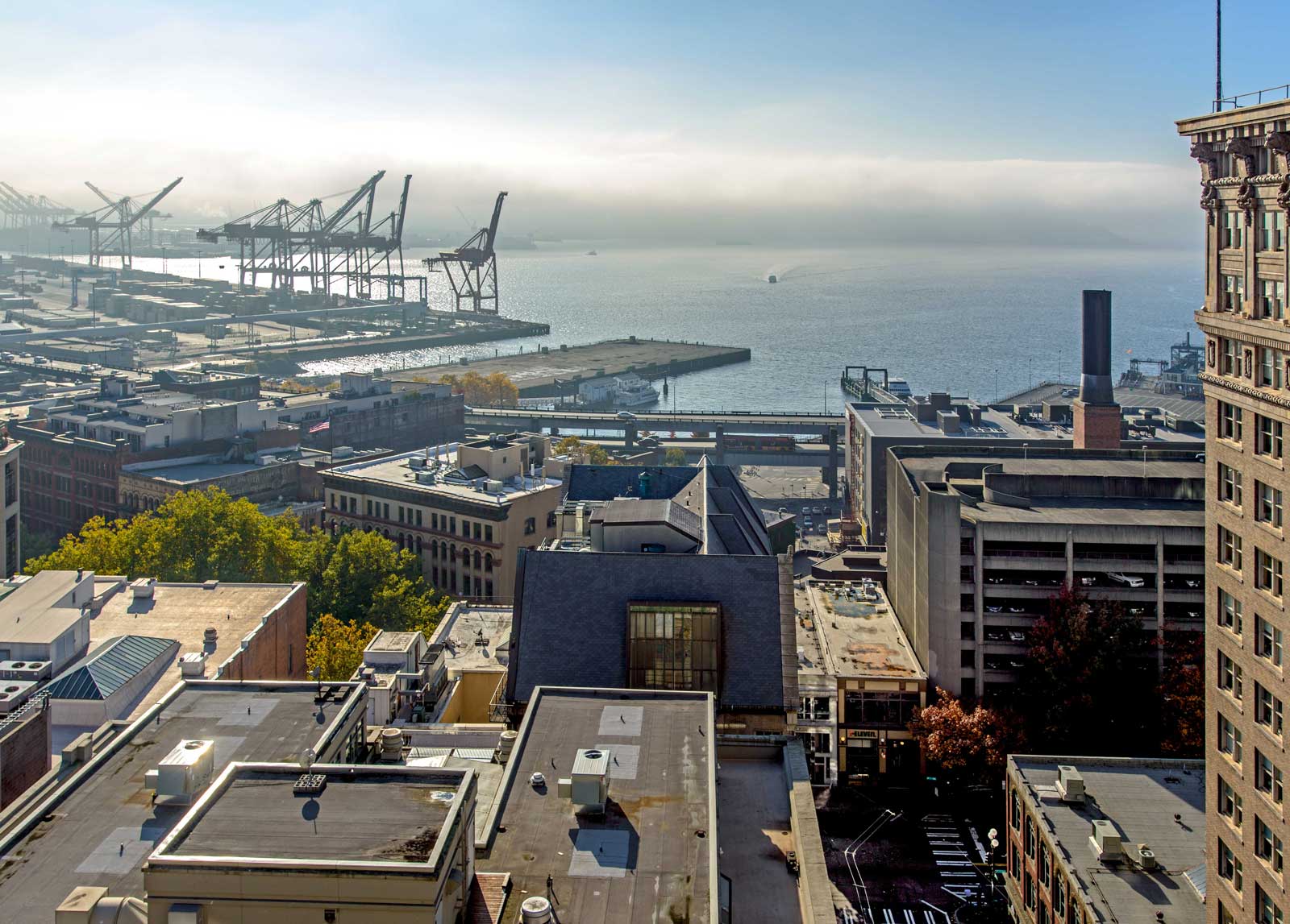 NOW: Both views were recorded from the roof of the Alaska Building at the southeast corner of First Ave. and Cherry Street. In the about 109 intervening years most of the Seattle waterfront here of long finger piers has been flattened and fitted with cranes for containers and more room for the ferries.