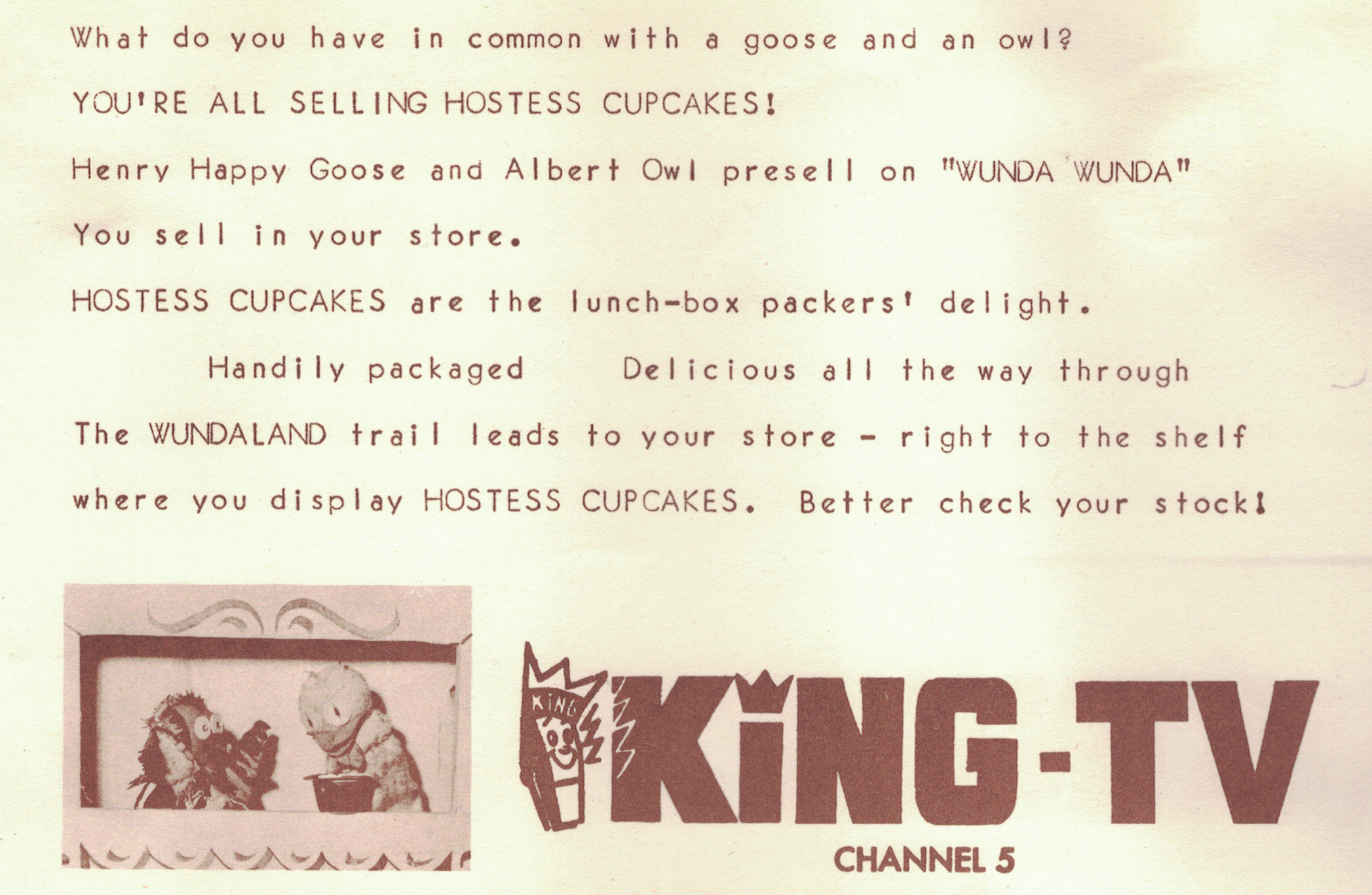 1950s mid WW KING Hostess ad January 7, 2022 2094 × 1365 Ruth Prins: the endorsements 1950s KING-TV ad for Hostess. (Courtesy Debra Prins) Like this:Like Loading... Like this:Like Loading...
