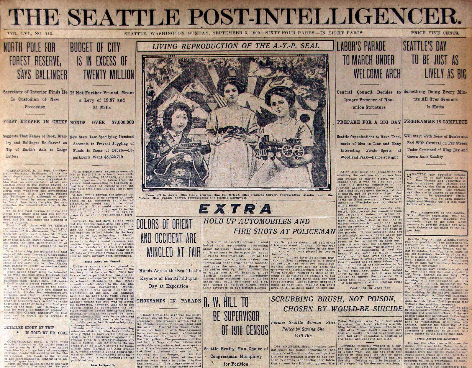 Another tableau, this one staged for the front page of the Post-Intelligencer for Sept. 9, 1909. The caption to the screened photo reads, “From left to right: Miss Koye, representing the Orient; Miss Frances Sarver, representing Alaska and the Yukon; Miss Fannie Sarver, representing the Pacific Northwest.”