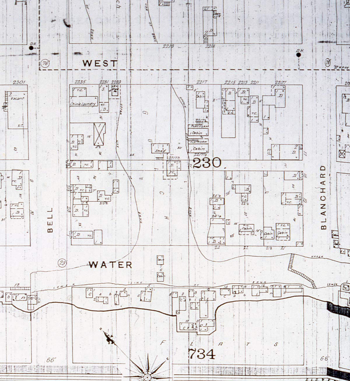 This topographical map of the waterfront at Bell Street shows the feature of the “Belltown Ravine” intruding into the hillside and neighborhood from the waterfront. Although dated 1893 some of the features – footprints – are the same (or nearly) as in ca. 1900.