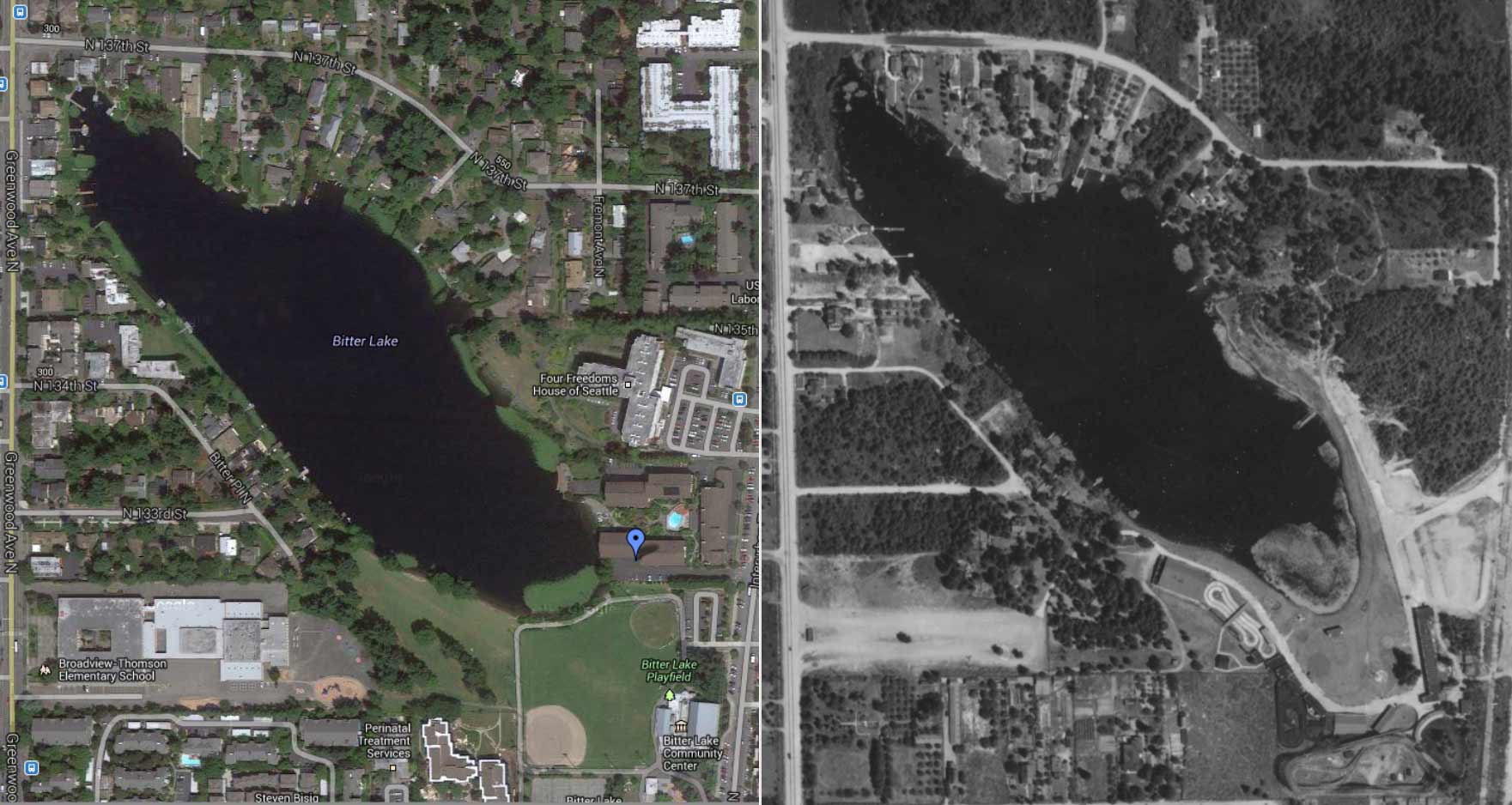 Bitterlake-Aerials,-Goodle-&-1936-WEB August 17, 2013 1761 × 938 Bitterlake-Aerials,-Goodle-&-1936-WEB Bitter Lake recently from space, on the left, and on the right from high above Playland in 1936. [We suggest that to study it you click it – twice.]