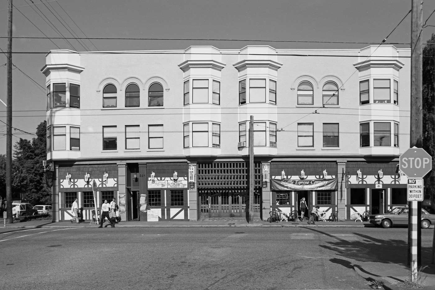 I took this high resolution snapshot of the Canterbury most likely in the 1990s. I no longer remember the occasion. Perhaps I was heading for some of Vegitarian Lasagna they are promoting on the banner. I remember the baked potatos. Like the photograph above this one, here we look east on Mercer to 15th Ave. East.