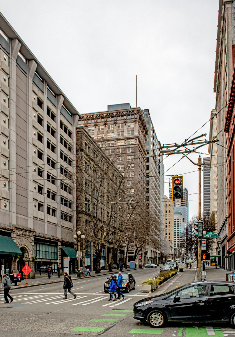 THEN: Looking south on Second Avenue through its intersection with Seneca Street, ca. 1945. (Courtesy, Museum of History and Industry)NOW: Built in 1902-3 the Lumber Exchange Building on the southwest corner, was replaced by the Second & Seneca Building in 1991.
