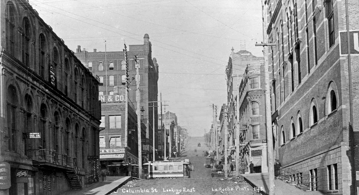 Columbia-fm-Post-c92-WEB November 27, 2011 1200 × 653 Columbia-fm-Post-c92-WEB Pioneer photographer LaRouche’s look east on Columbia, ca. 1891, from Post Alley. Part of the Chapin corner can be seen near the scene’s center.