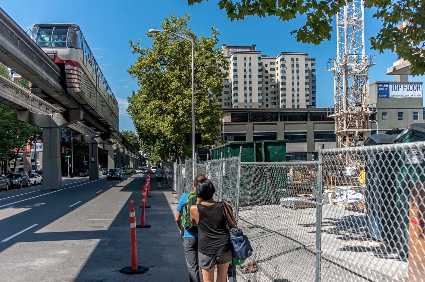 NOW: A double irony for the Denny Regrade is that the two largest parts of this effort began in 1907 and 1929, and only months before economic “panics” put caps to booming visions of skyscrapers. The modern “resurrection” of the Denny Regrade came first in the 1970s. Here at 5th and Battery, only now does the condominium euphoniously named Insignia Seattle prepare to lift the regrade 41-stories. Here as well the 1962 World’s Fair Monorail in Jean’s vigorous “now” may be considered a kind of elevated “repeat” for the 1929 conveyor.