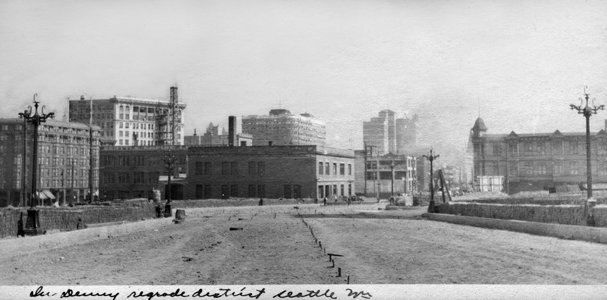 Looking south on 3rd Ave. with the photographer’s back to Lenora Street. Third is being prepared here for brick paving. At the center is the new Fire Station. This looks back thru the foreground of the 3rd Ave. subject printed directly above this one. This dates from ca. 1910.