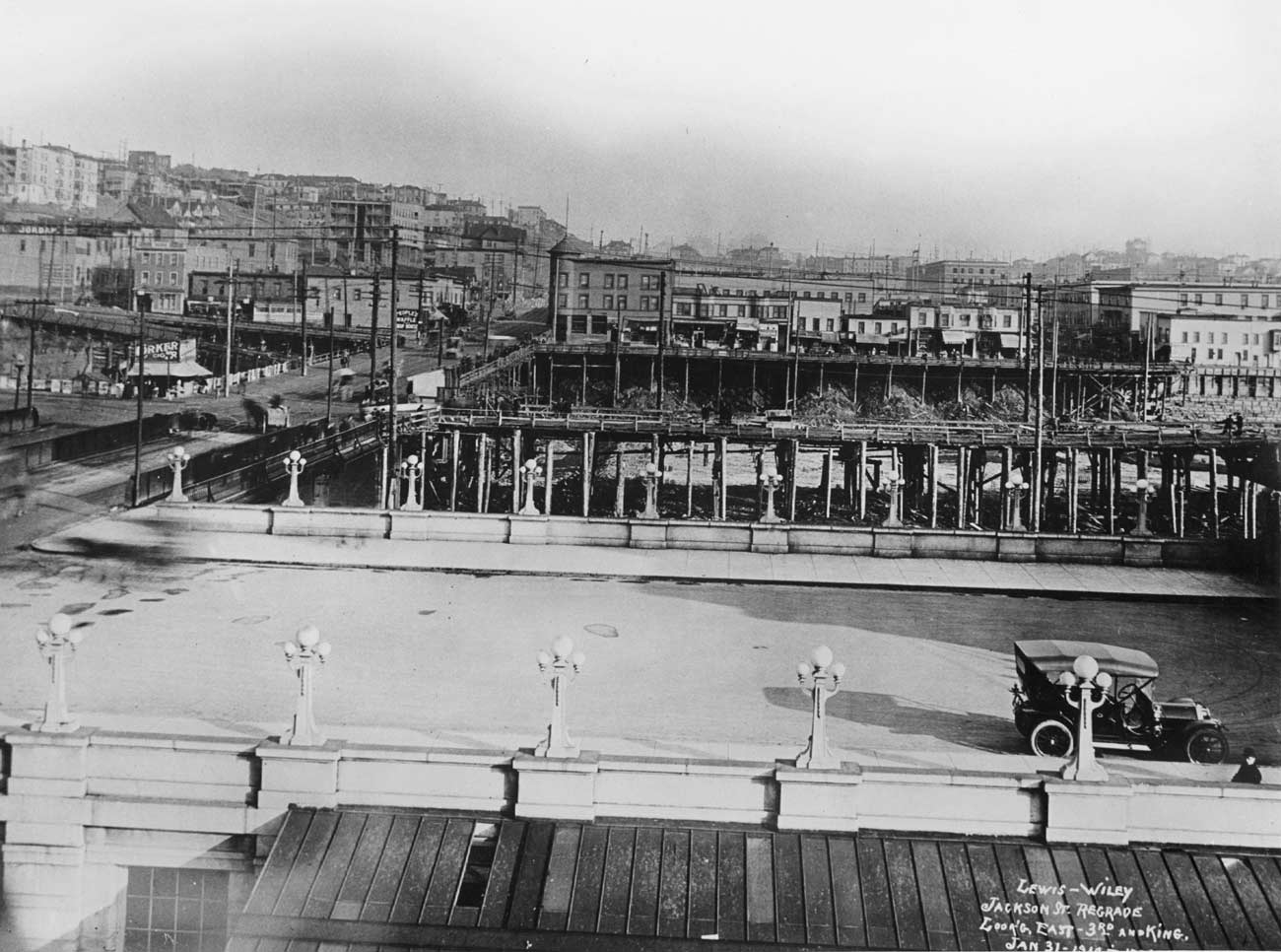 Looking east across the parking lot at the front of the Great Norther “Union Depot” (out of frame to the right). Two pits show here beyong the lot. The first is west of Fourth Avenue, which is the trestle that runs from Jackson Street on the left to off-frame on the right, and the pic to the east of 4th, which is the same hole as that shown in its rawer condition in the image above this one, which dates from 1910. Notice that Holy Names, and its tower, are gone, razed by the Jackson Street Regrade.