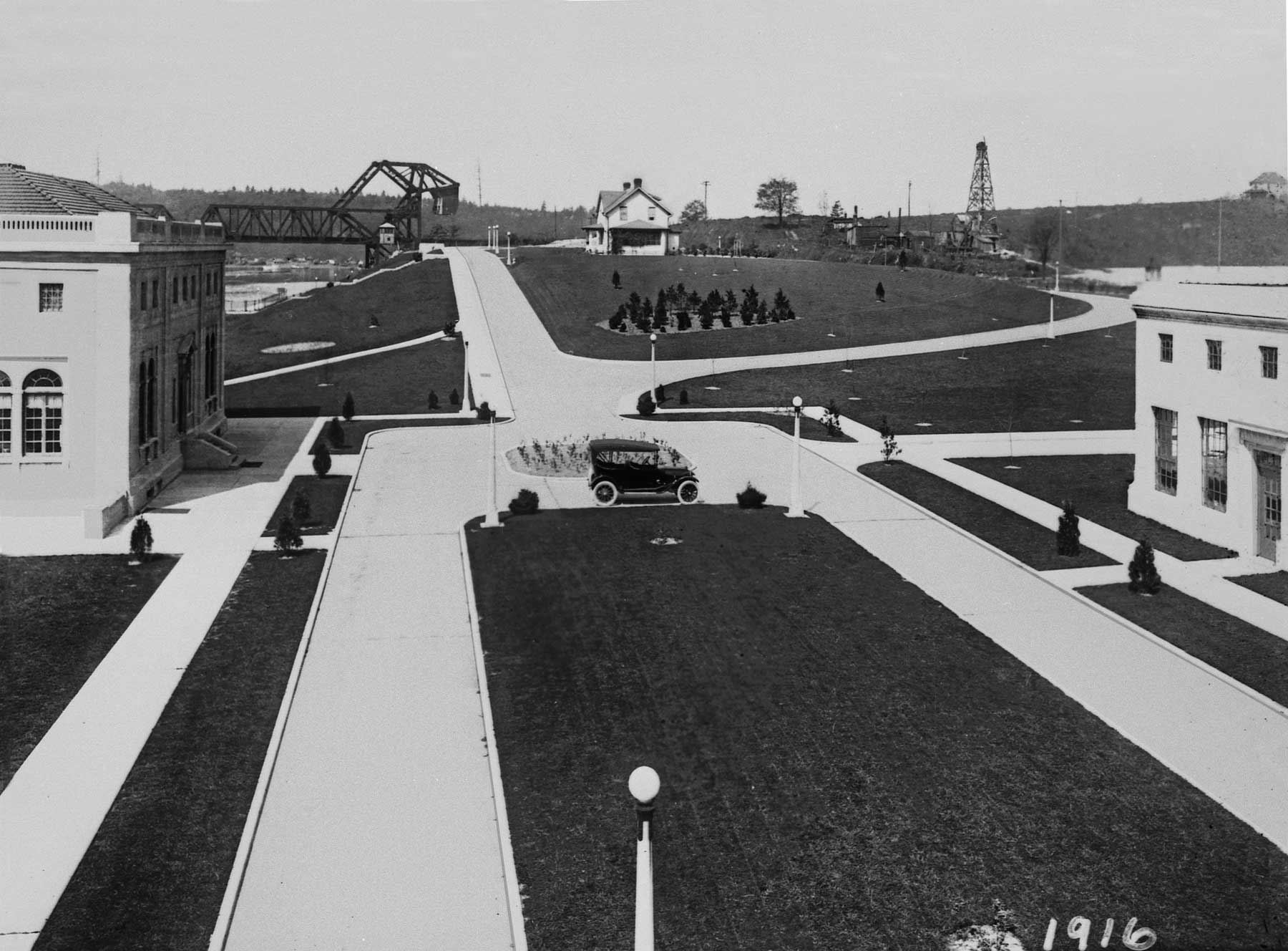 THEN: Looking east from the roof of the still standing testing lab, the Lock’s Administration Building (from which this photograph was borrowed) appears on the left, and the district engineer’s home, the Cavanaugh House (still standing) on the center horizon. (Photo courtesy Army Corps of Engineers at Chittenden Locks)