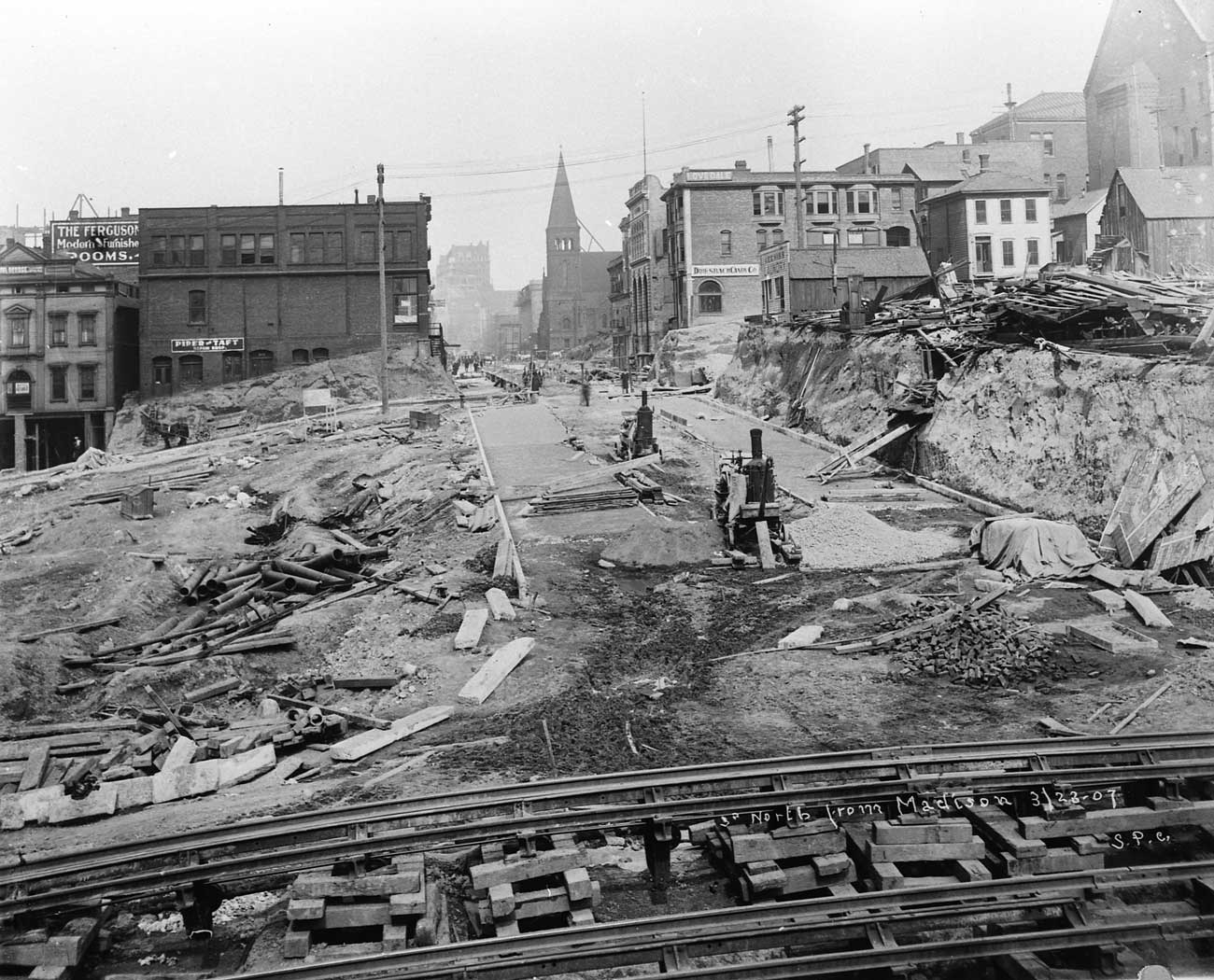 Madison-Trestle-LN3-WEB2 September 18, 2011 1300 × 1050 Madison-Trestle-LN3-WEB2 North on Third Ave. from the Madison Street trestle for the cable line and buring the 3rd Ave. Regrade. The spirte of Plymouth Congregational Church shows cemter at University Street. (Courtesy Lawton Gowey)