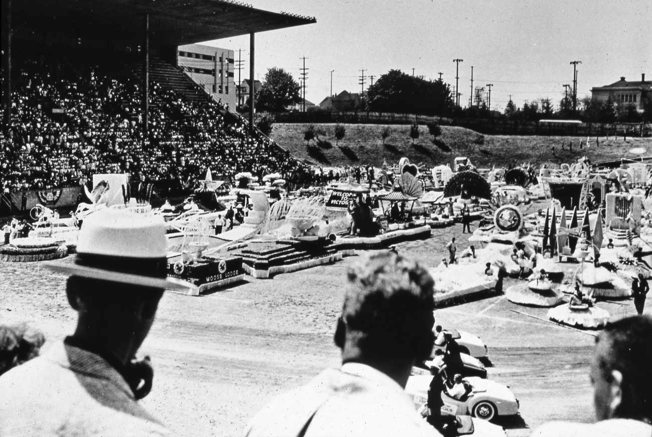 Memorial Stadium before Century 21. Some of the Warren Street School shows on the right. Bringing the Seafair floats home to the stadium was a popular practice for a few years at least. I remember attending, and filming, such in the early 1970s following a torchlight parade. I did a long timelapse of the floats as they circles that field before taking their place. A real review.
