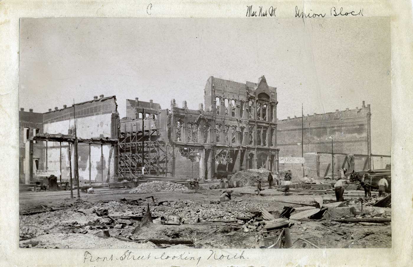 Merchants-1889-ruins-WEB May 14, 2011 1400 × 907 Merchants-1889-ruins-WEB The ruins of the Merchant bank stand at the center of this post-89fire scene that looks northwest from Second Avenue. The banks front facade held up but more importantly its basement vault did even better.