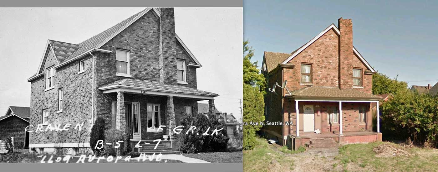 Ordinary with its plan but lavish with its eccentric brick, this residence faces Aurora at 6609, and so it looks across the speedway to Green Lake. There is along this west side of Aurora a long line of residences, which, I assume, were zoned free from commerce in the interests of the park. The colored shot is used courtesy – we hope – of google and its street views. Note that the porch posts have given their bricks and the complexities of the front door have been reduced. Directly behind these home on Linden Ave. commerce was allowed to pursue its ambitions in a zone of commercial anarchy – more or less. The next photograph – again from the tax survey – shows a modest example. We may wonder if they could afford the tax assessment.