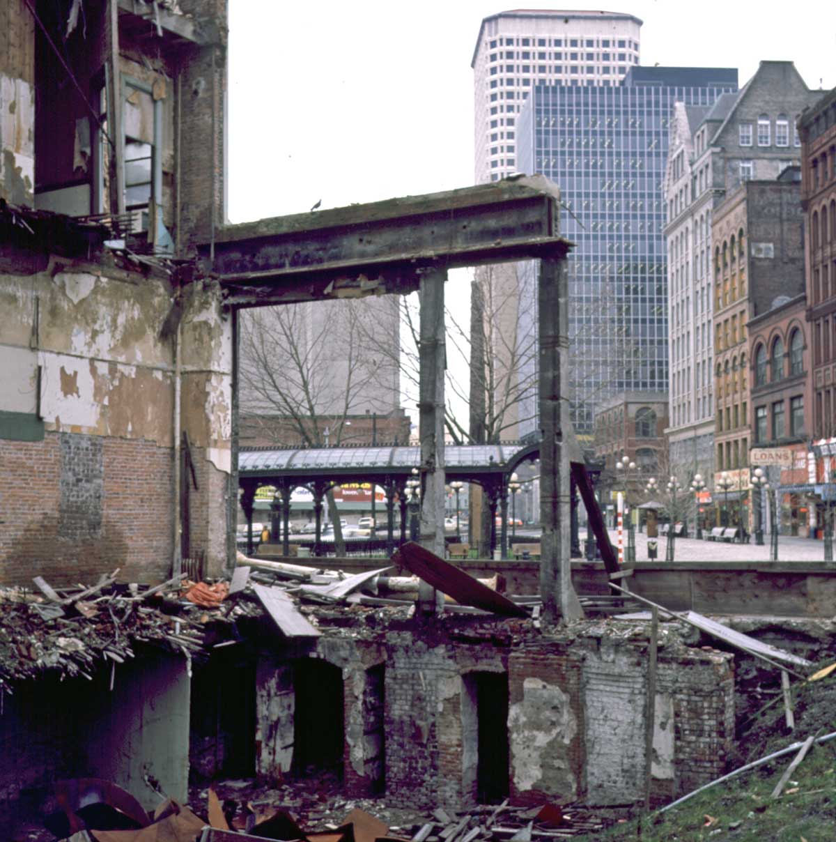 olympic-block-ruin2-7-74web December 6, 2009 1200 × 1208 olympic-block-ruin2-7-74web View across Pioneer Square from Olympic Buildilng area. FEb. 7, 1974. [The collapse secton of the Olympic block provided for a few months Pioneer Square’s own repeat of the romantic passion for classic ruins.]