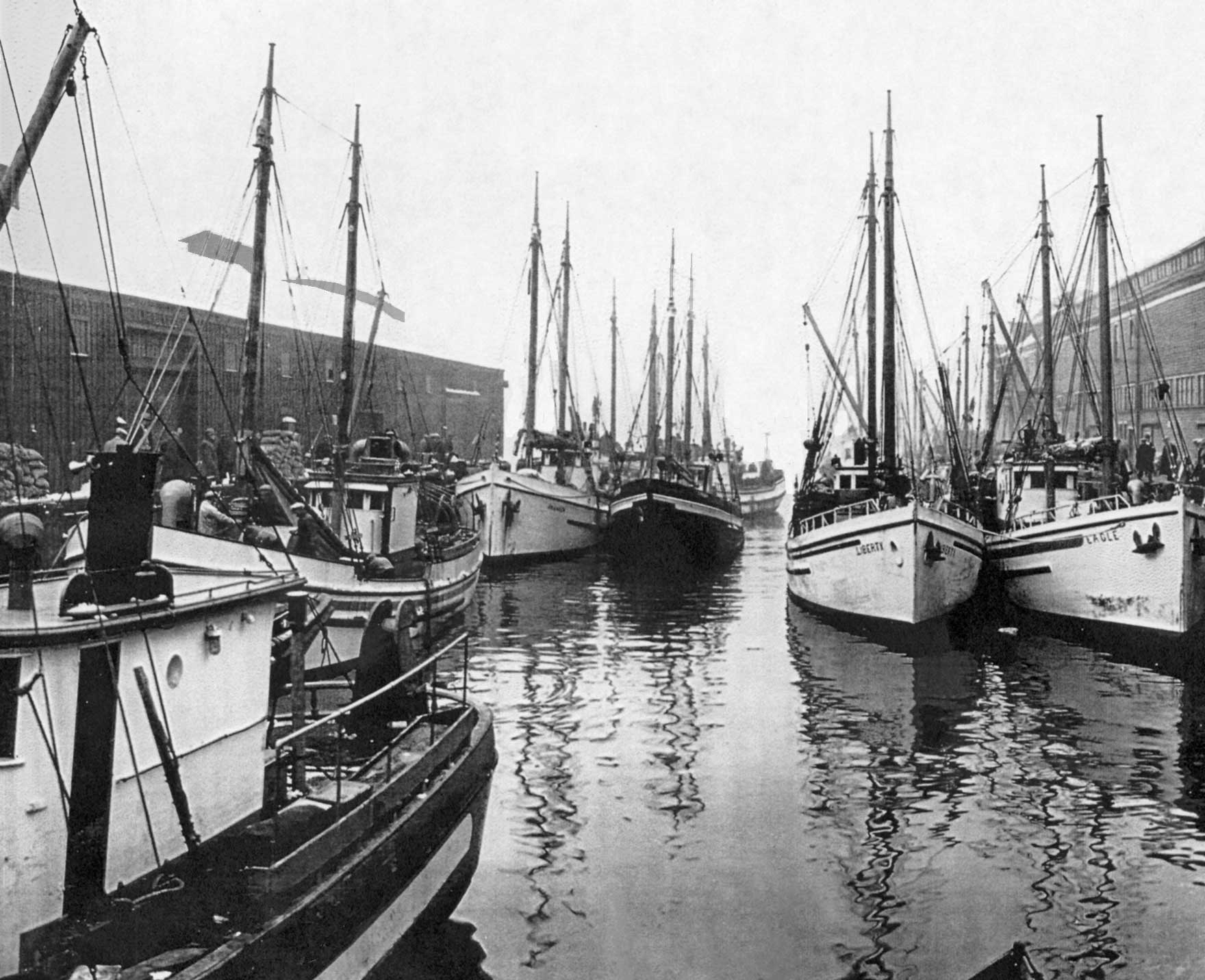THEN: Throughout much of the first half of the 20th Century, the Pike Street Dock, here on the right, was home to the fishing fleet. If that is snow marking the roof of the Schwabacher Wharf, on the left, the fleet is here on a winter break. (Courtesy Lawton Gowey)