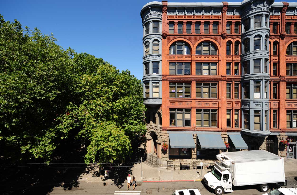 Now: For the contemporary repeat Jean Sherrard used his often-helpful extension pole to lift his camera high above the highest part of the parking garage that to many famously resembles a ship sinking between James Street, Yesler Way and Second Avenue. The trees of Pioneer Square hide First Avenue. On the right is the Pioneer Building, planned before the Great Fire of 1889 and built soon after it.