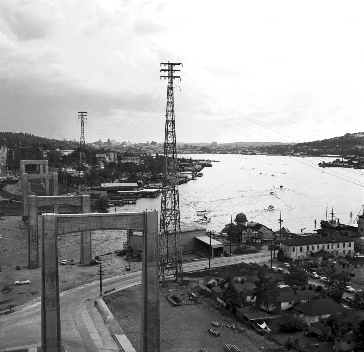 Victory Lygdman has put himself in what at least seems to be an exposed prospect to look south towards Lake Union from a concrete pier, perhaps, in the construcdtion of the Lake Washington Ship Canal Bridge on what was then still being called The Seattle Freeway.