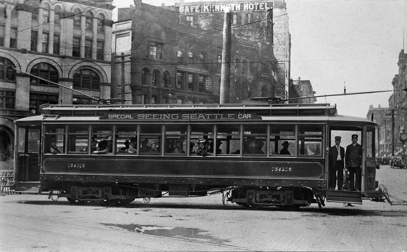 SEA-SEAT-P.SQUARE-THEN-web May 22, 2011 1400 × 868 SEA-SEAT-P.SQUARE-THEN-web A “special Seeing Seattle Car” poses in Pioneer Square sometimes after its introduction in 1903 but before the completion of the Pioneer Square Pergola in 1909.
