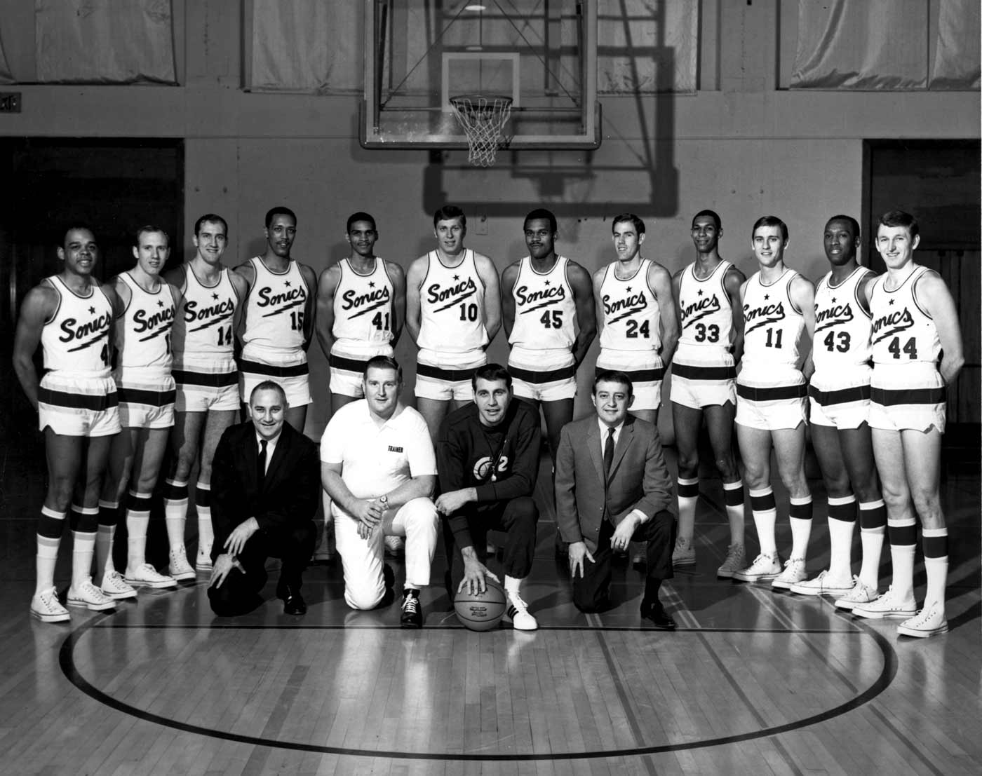Sonics-1st-year-67-68-WEB January 6, 2013 1400 × 1107 Sonics-1st-year-67-68-WEB The first Sonics, from 1967-68. (Al Bianci is the head coach, kneeling in black at the center. Can you name any of the others – players and coaches?)