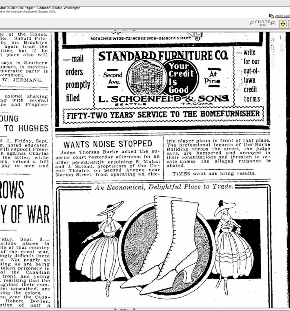 Here S. Mukai, the founder of the Atlas, is in early trouble with “he built Seattle” Judge Thomas Burke, for running a player piano on Second Avenue and so annoying the tenants in the Burke Buildings at Second’s northwest corner with Madison Street, then.