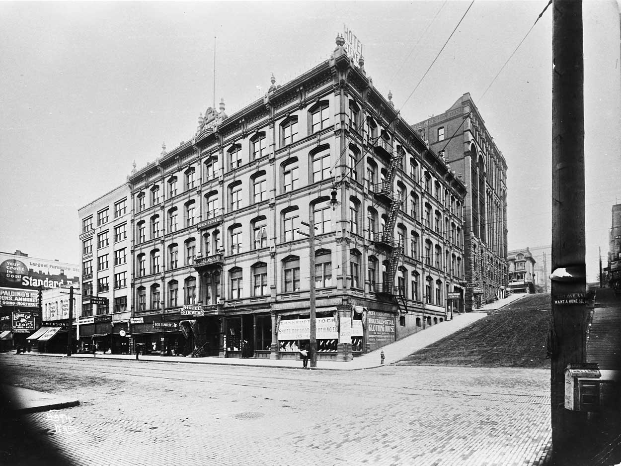 Stevens-Hotel-kitkorn-WEB October 23, 2011 1250 × 937 Stevens-Hotel-kitkorn-WEB The Stevens Hotel that took the place of the Frye Opera House following the ’89 fire. The Burke Building is behind it, and the Palace Hotel to the left or north of it. The Star Theatre is also evident at the southeast corner of Marion and First.