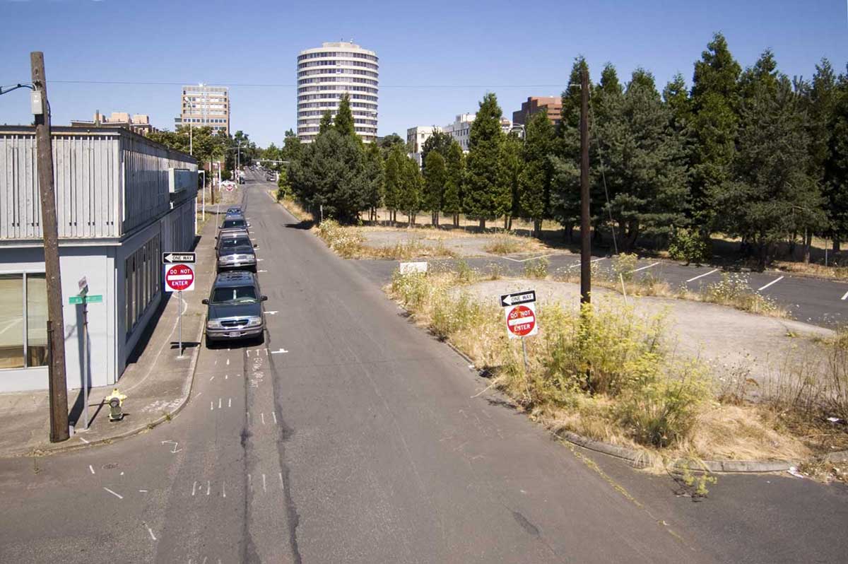 On a hot day during the summer of 2005 Jean lifted his camera with his 10-foot pole to a grade that approximated that of Simmers shot from the elevated railroad grade. Jean, however, has moved considerably closer to the the once busy corner of 3rd and Washington to show it moribund condition in ’05. The building of the freeway thru Vancouver used these blocks for interchanges connected with it, which are hidden behind the screen of trees on the right.