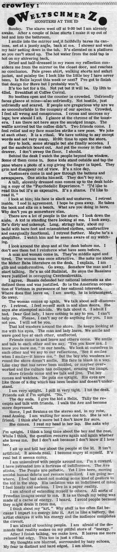 Walt weltschmerz August 25, 2013 500 × 2343 Walt weltschmerz Walt’s more or less regular feature Weltschmertz from HELIX, this one from the first week of August 1968. (This was another one of the issue in which we failed to print the date.)