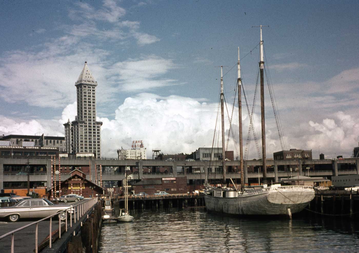 This look up Yesler Way past the stern of the Wawona is also date 1964, and so adds some small uncertainty to the claim two captions above that the Wowona most likely was towed from the Pier 70 slip to the south side of Pier 54 that year. It may have come from here between Piers 50 and 51, or perhaps moved from here to Pier 70. There are other possibilities, of course. On the left is the post-Century 21 location of Ye Olde Curiosity Shop. Since these piers, covering the former sprawl of Yesler’s Wharf (especially Pier 51 on the left), were eliminated for the construction of better vehicle approaches to Colman Dock, the Curiosity Shop has taken the northeast corner – at the sidewalk – of Ivar’s Pier 54, in the space where he opened his aquarium first in 1938. (I know this stuff by heart.)